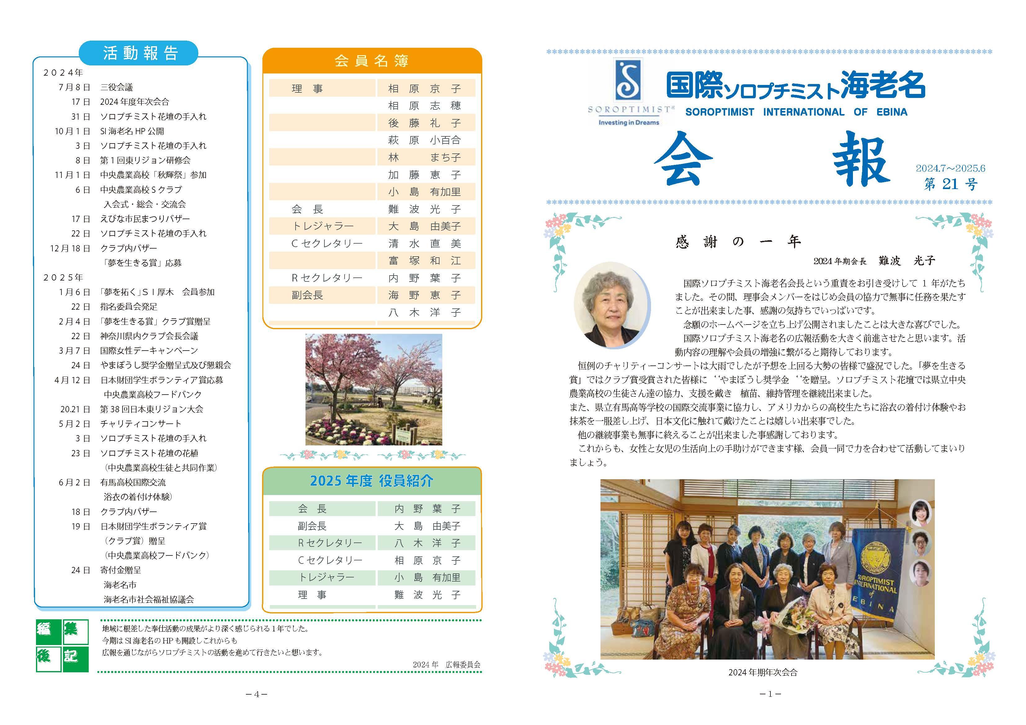 会長 内野 葉子 副会長 大島由美子 Rセクレタリー 八木 洋子 Cセクレタリー 相原 京子 トレジャラー 小島有加里 理事 難波 光子 |